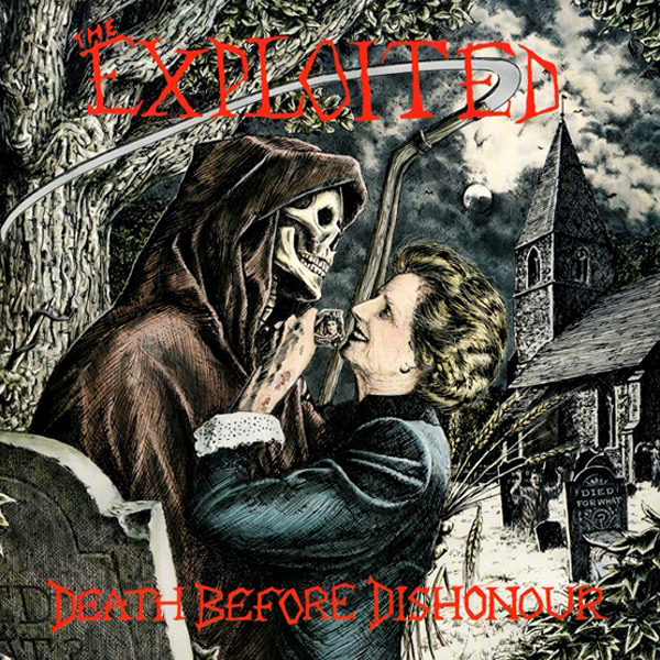 „Death Before Dishonour“ vyšla původně v roce 1987 a tahle verze její původní vydání – stejně jako v případě „Horror Epics“ – věrně kopíruje, dostanete tedy dobový záznam nejen po obsahové, ale i grafické stránce. V pořadí páté album této skotské party nepatří k jejich nejznámějším počinům, důvodů je hned několik. Nejvýraznější z nich jsou, narozdíl od předchozích i následných desek, absence nějakých vyložených taháků a ani ne tak oscilování mezi dvěma póly, což do jisté míry pro předchozí „Horror Epics“ platilo, kdežto spíš nespadání ani do jednoho z nich. Vlastně to většinou ani moc nezní jako typicky klasičtí Exploited, a to ať vezmeme-li jejich rané nahrávky, nebo ty pozdější – přesto je z toho jejich rukopis jasně cítit, Wattie je totiž autorem většiny písní, přestože sestava se zde opět změnila. Právě jakési upozadění této nahrávky ale může v leckom probouzet onen pud větší zvídavosti, „DBD“ totiž z mého pohledu není tolik probádaná jako většina ostatních alb Exploited, a tím pádem ji může obalovat punc jakési větší tajemnosti nebo unikátnosti, s trochou nadsázky řečeno.
